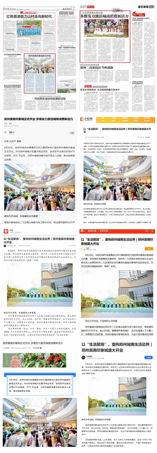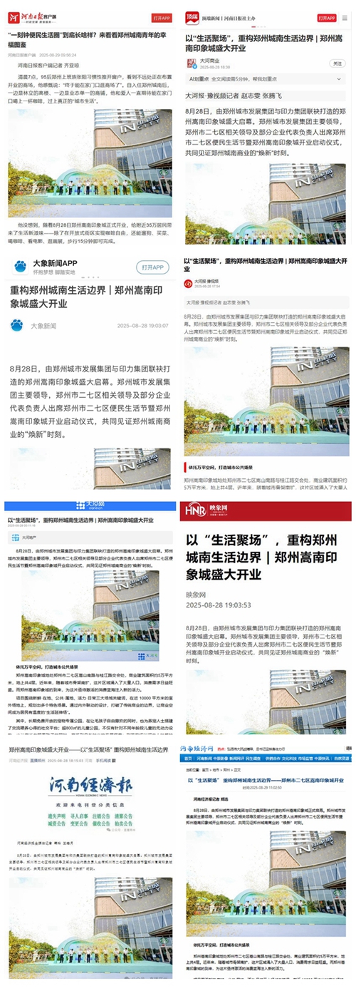 8月28日,鄭州城南商業格局迎來重大變革,由鄭州城市發展集團與印力集團攜手打造的鄭州嵩南印象城盛大啟幕,開業首日客流達12.6萬人次,迅速成為全城矚目的焦點。這一盛事引發了各大媒體的廣泛關注,河南日報客戶端、頂端新聞、大象新聞、大河報、大河網、映象網、河南經濟報、鄭州日報、鄭州晚報、鄭州廣播電視臺等媒體紛紛聚焦,對其開業進行了全方位、多角度的報道。